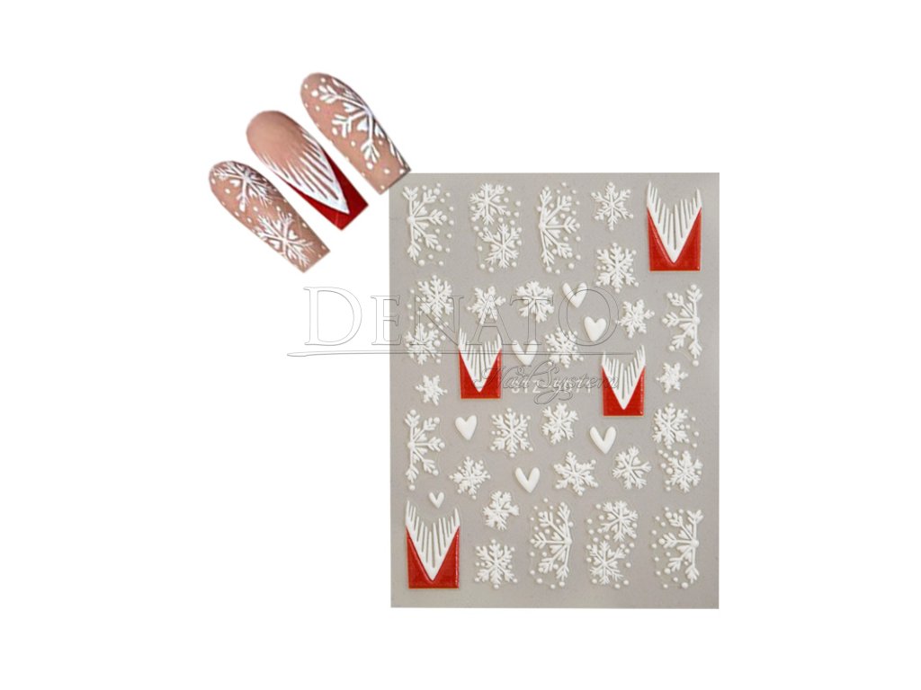 Magnifiques autocollants pour ongles d’hiver avec des motifs 3D blancs de flocons de neige et de cœurs. Feuille d’environ 8 × 10 cm pour une manucure festive et élégante.