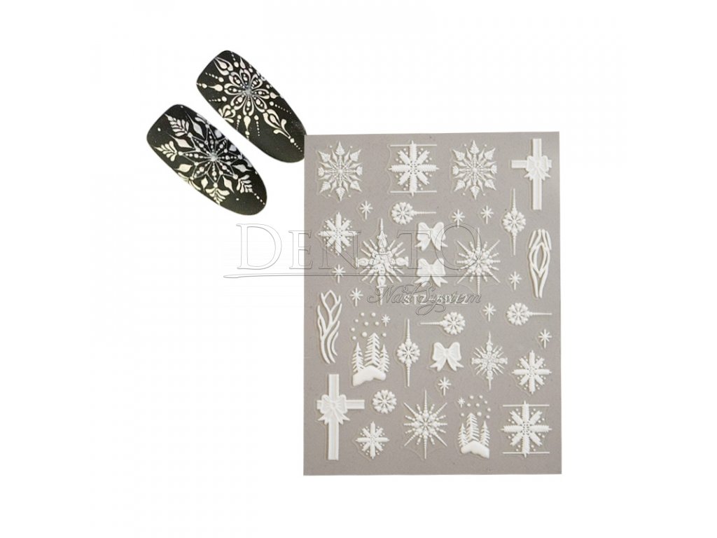 Élégants autocollants pour ongles d’hiver avec des motifs 3D blancs – flocons de neige, rubans et étoiles. Feuille d’environ 8 × 10 cm pour une manucure festive et raffinée.