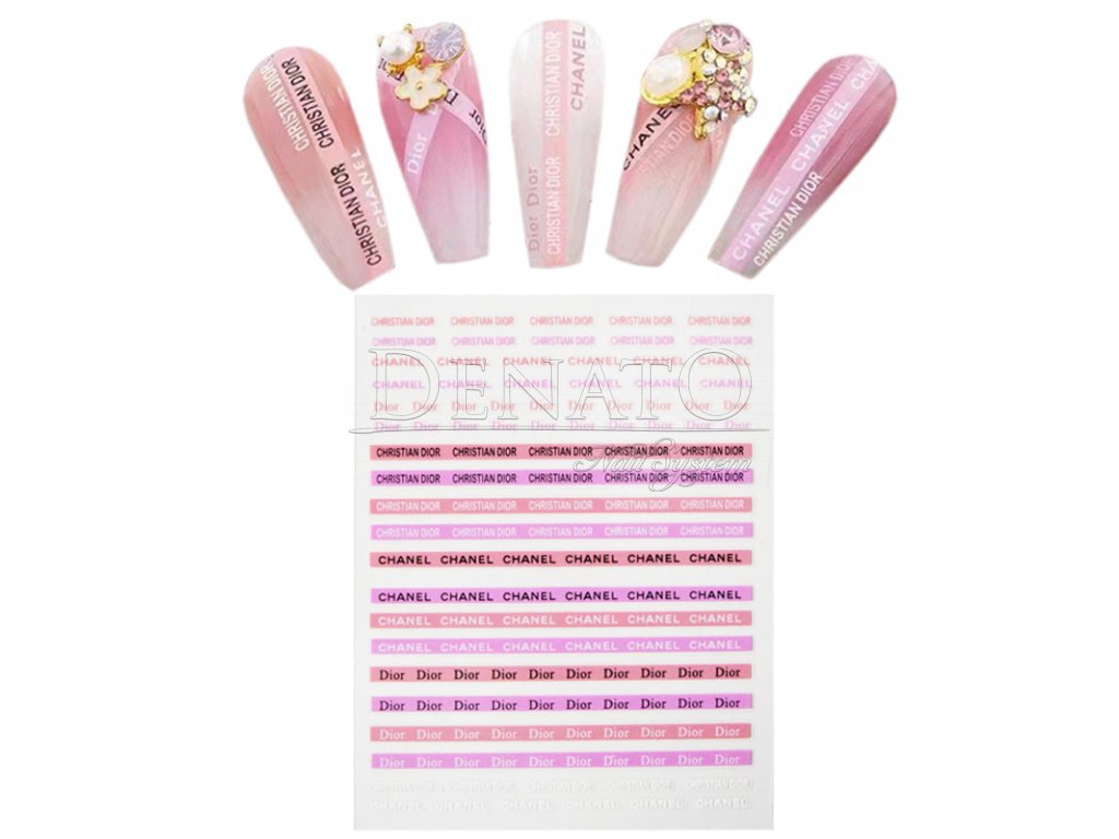 Élégants autocollants pour ongles avec des inscriptions stylisées dans des tons de rose, violet et blanc. Feuille d’environ 8 × 10 cm pour une manucure moderne et raffinée.