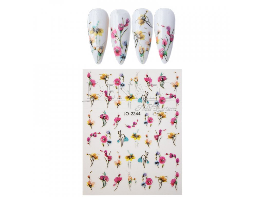 Délicats autocollants pour ongles avec des motifs floraux colorés dans des tons rose, jaune, bleu et violet. Feuille d’environ 8 × 10 cm. Idéals pour des créations élégantes, romantiques et inspirées du printemps.