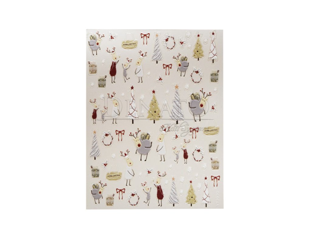 Élégants autocollants pour ongles de Noël avec rennes, sapins, cadeaux et rubans dans des tons dorés et beiges subtils. Feuille d’environ 8 × 10 cm apportant une touche hivernale raffinée à votre manucure.