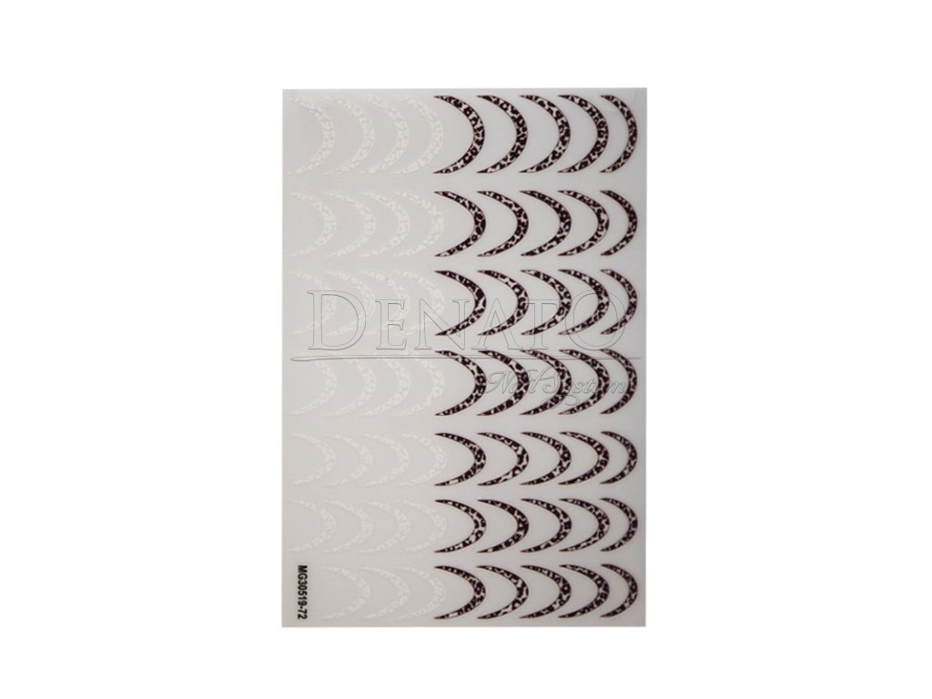 Élégants autocollants pour ongles en forme de croissant dans des tons noir et blanc avec un motif délicat. Feuille d’environ 8 × 10 cm, idéale pour la manucure française, le contour des ongles ou une décoration minimaliste.