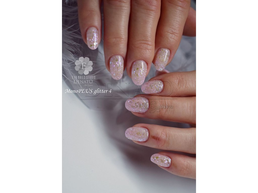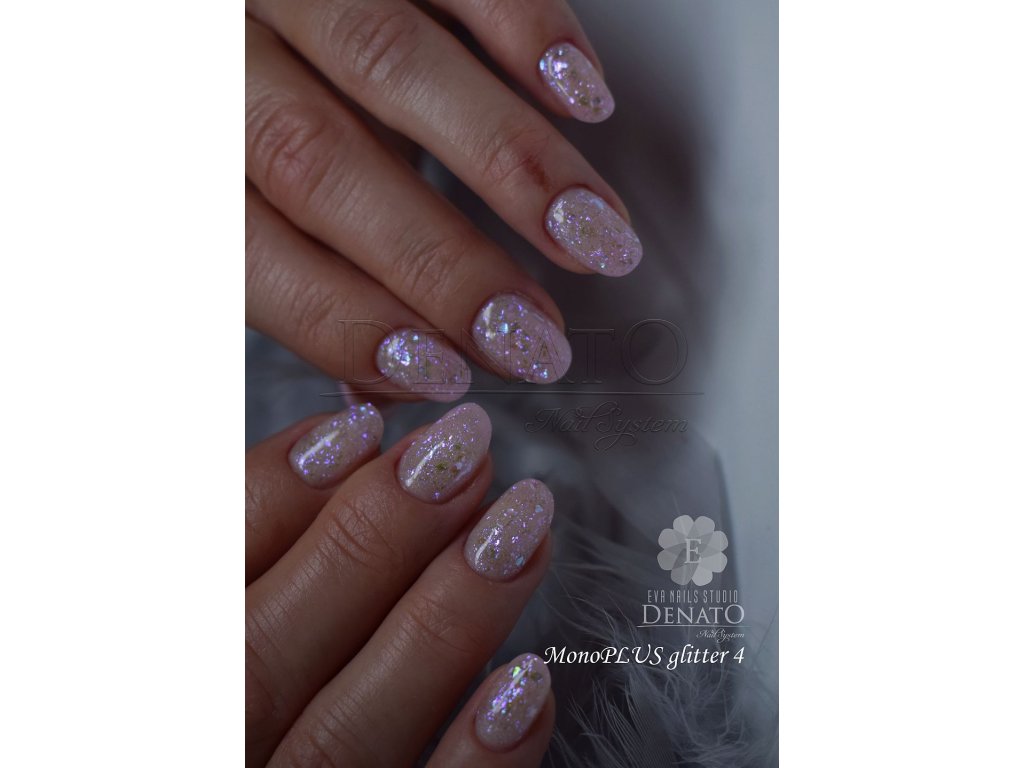 MONOPHASE PLUS Glitter 4 – gel de construction UV/LED monophase innovant, à viscosité moyenne, texture légère et effet pailleté violet subtil.