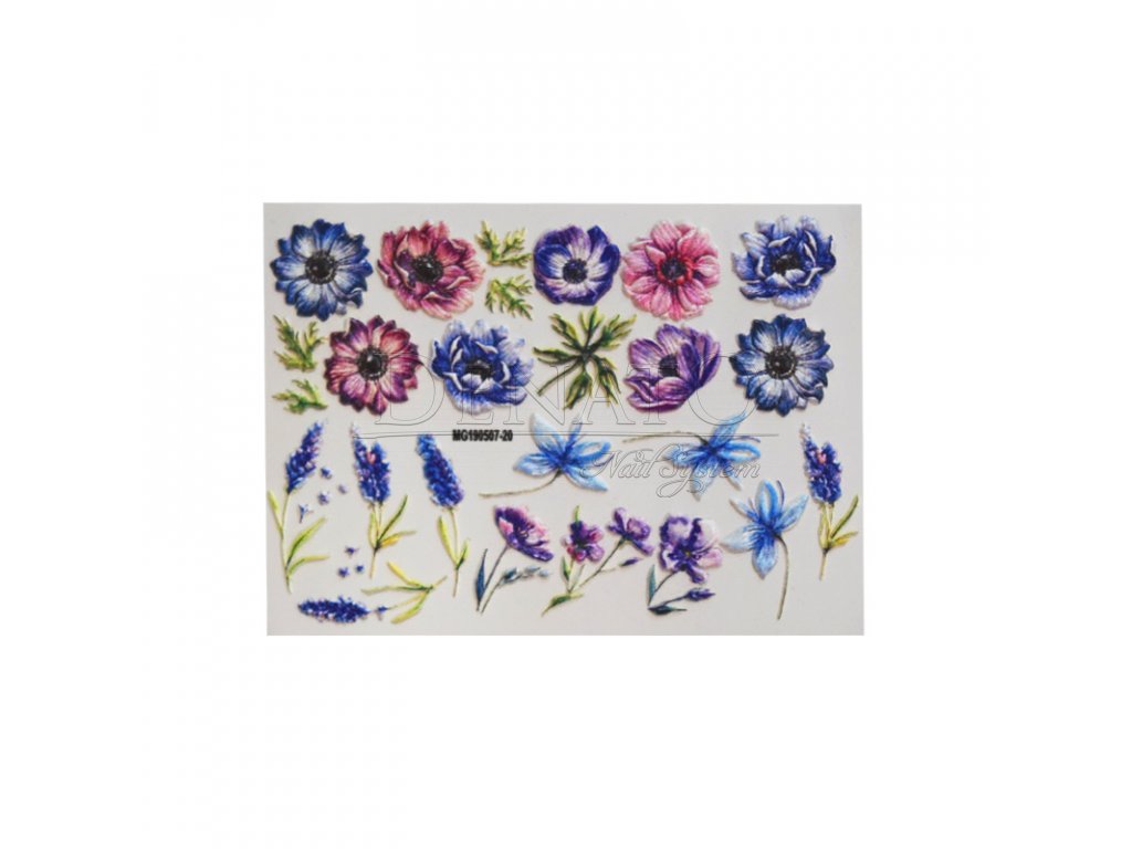 Stickers à l’eau pour ongles avec de magnifiques motifs floraux dans des tons bleus, roses et violets. Parfaits pour des manucures colorées, printanières ou estivales.